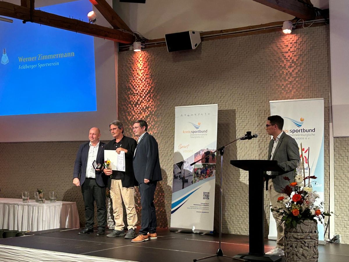 Unter den zu Ehrenden war auch der Vorsitzende unseres Feldberger Sportvereins Werner Zimmermann. Er hat den Sportverein vor genau 40 Jahren mit aus der Taufe gehoben und steht unserem Verein eben solange als Vorsitzender vor. Für seine Verdienste um den Sport in unserer Gemeinde und im Landkreis wurde Werner mit der Ehrenplakette des Kreissportbundes geehrt.